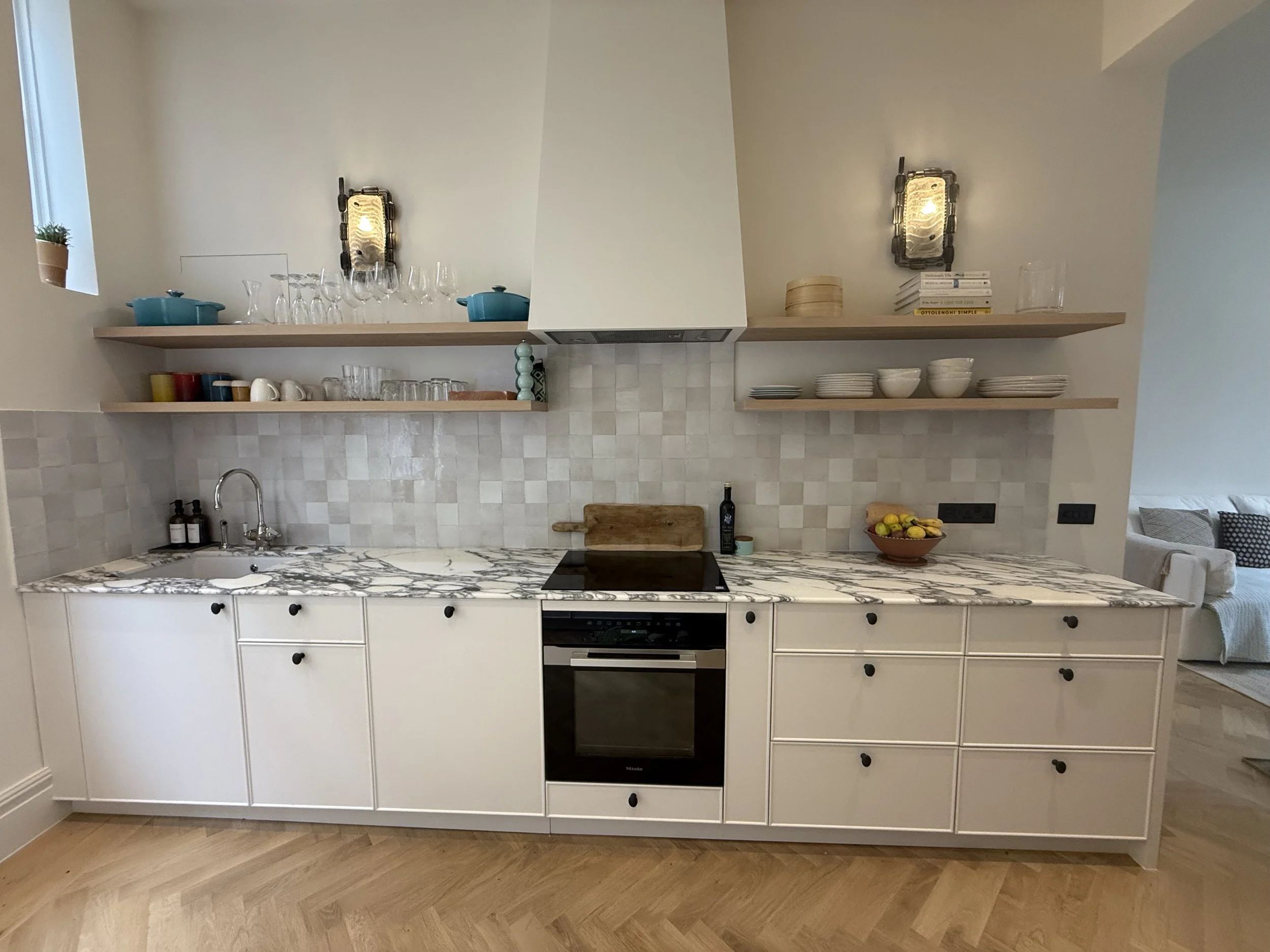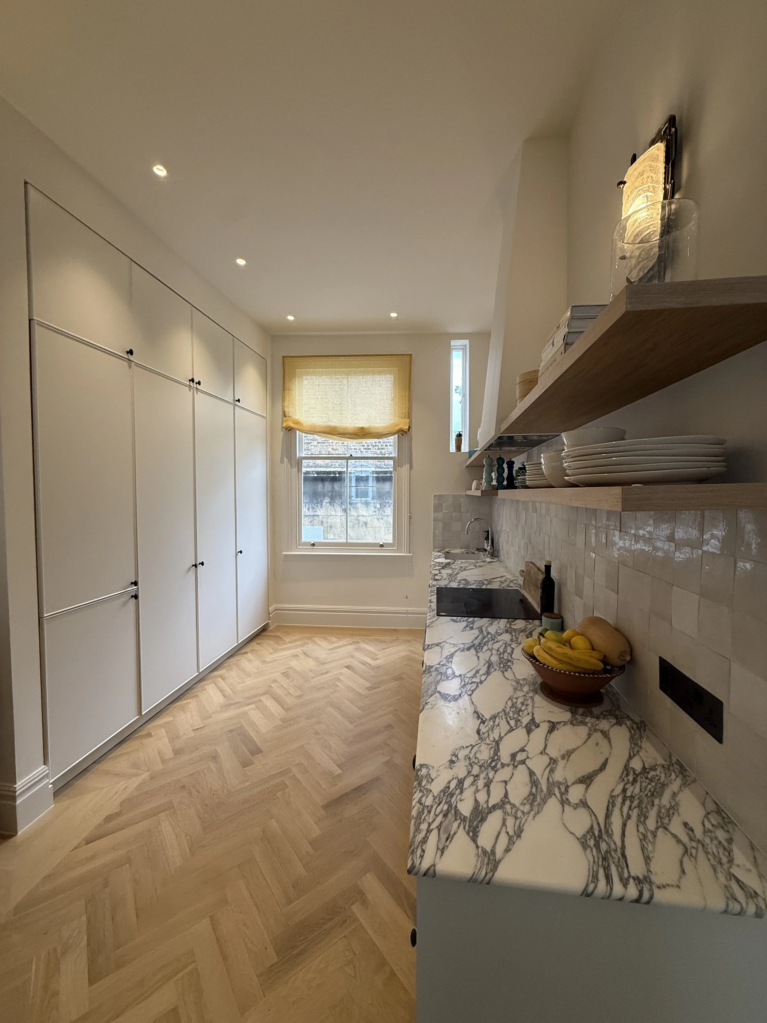 This Notting Hill apartment required a soft touch, with life and heart carefully injected back into the space. Staying true to the Victorian features of the building, the skirting and parquet flooring were faithfully replicated from the originals. The kitchen was a bespoke design, created in collaboration with Beyond Joinery, featuring Arabescato Corchia marble and handmade Moroccan zellige tiles. The result is a modern kitchen filled with warmth, soul, and natural materials.