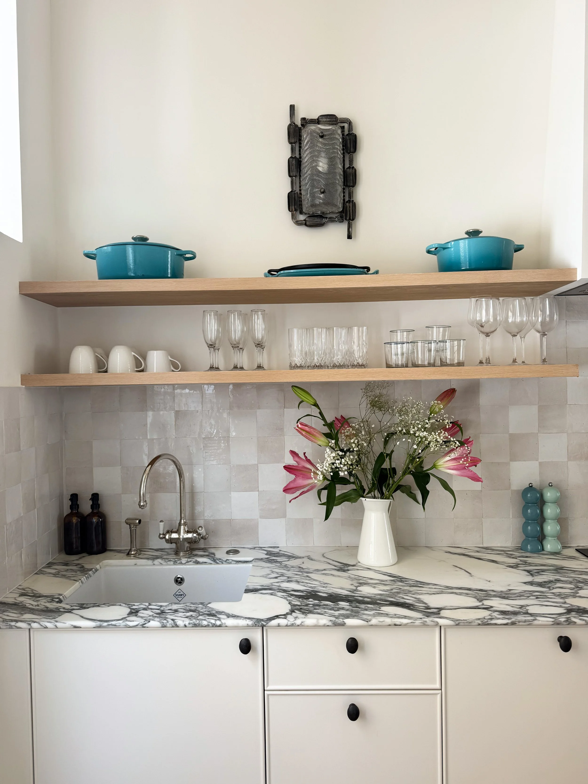 The kitchen was a bespoke design, created in collaboration with Beyond Joinery, featuring Arabescato Corchia marble and handmade Moroccan zellige tiles. The result is a modern kitchen filled with warmth, soul, and natural materials.